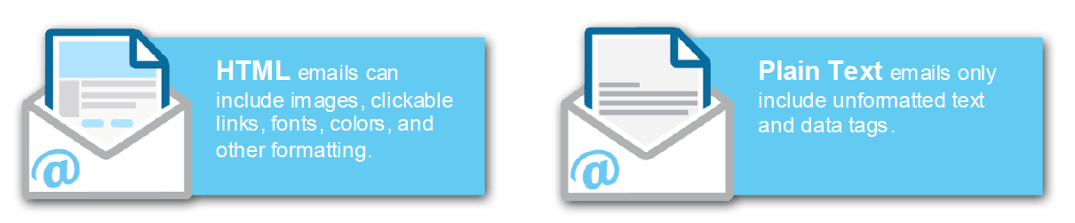 - Email Format lets you create HTML and plain text emails, or just plain text emails, stripped of formatting. Plain text emails are always sent as a backup in case recipients are unable to view the HTML version.